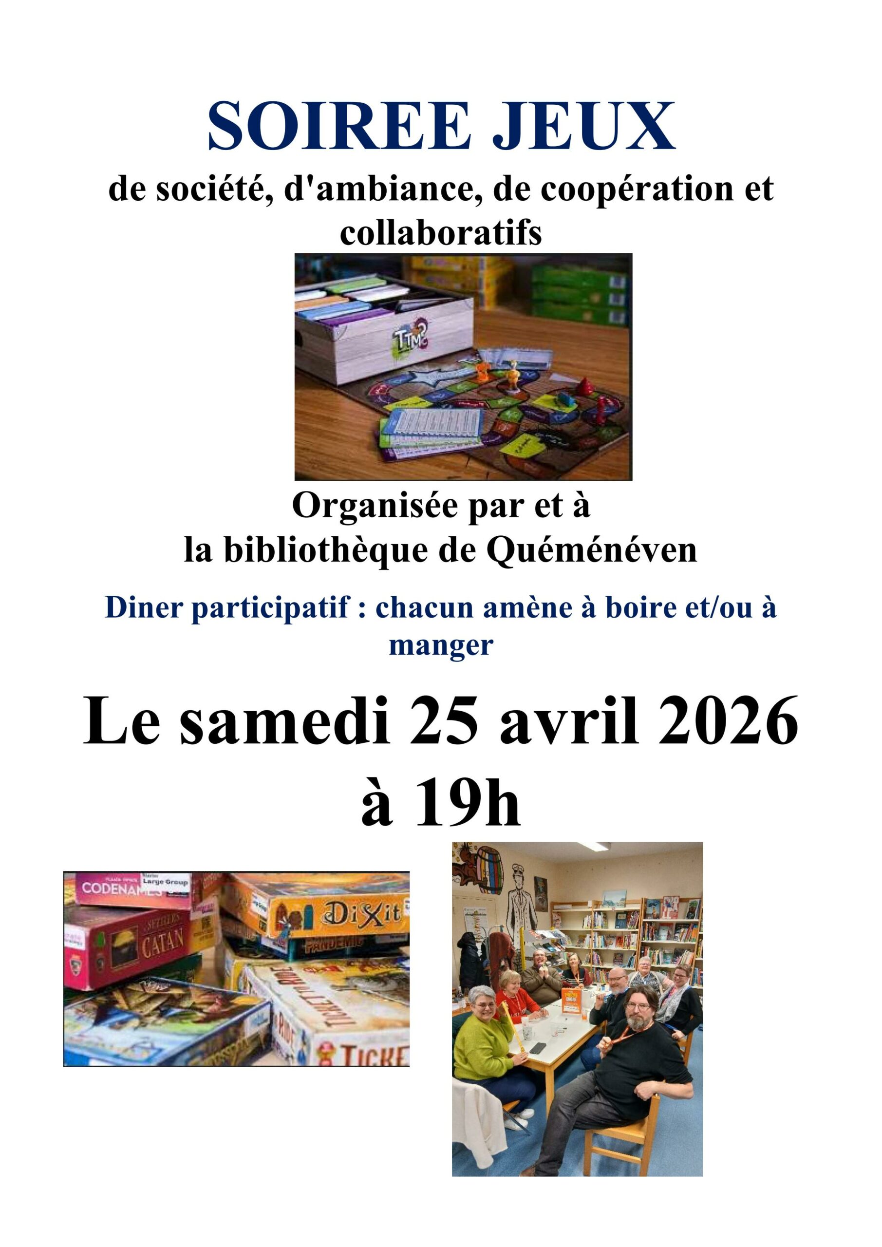 Bibliothèque : Soirée jeux18 avril 2026 Calendrier Quand : 25 avril 2026 @ 19 h 00 min 2026-04-25T19:00:00+02:00 2026-04-25T19:15:00+02:00 Animations / loisirs