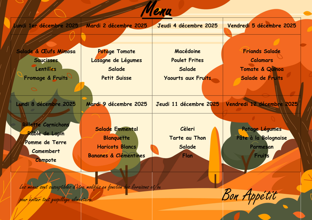 Menus du Restaurant scolaire du 1er au 12 décembre