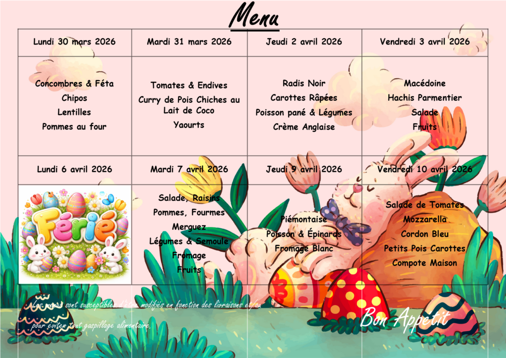Menu du Restaurant scolaire du 30 mars au 10 avril
