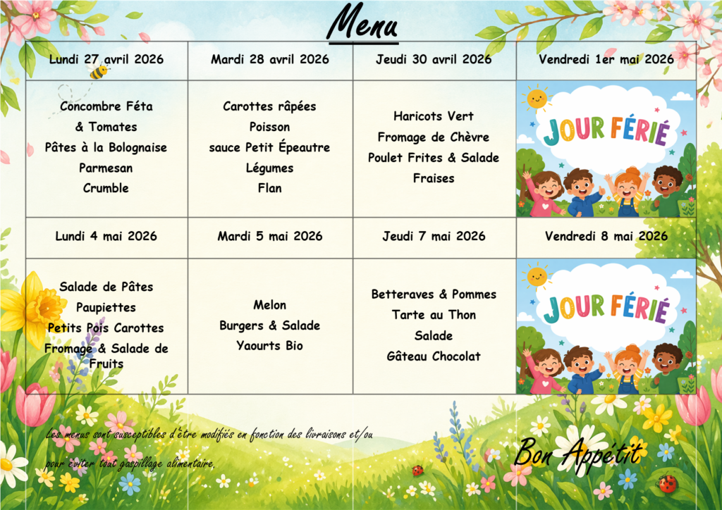 Menu du Restaurant scolaire du 27 avril au 8 mai